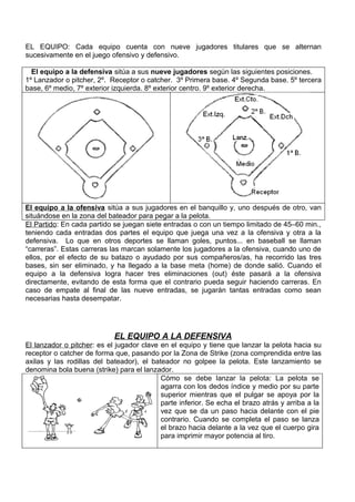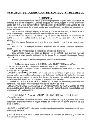 El documento proporciona una historia del origen del béisbol y softbol, desde juegos antiguos con palo y bola hasta su desarrollo como deportes modernos. También resume las reglas básicas de ambos deportes, incluidas las posiciones de los jugadores, cómo anotar carreras, y formas de eliminar a los corredores. Finalmente, ofrece consejos para adaptar el béisbol a niños, como usar bolas y distancias más pequeñas para hacer el juego más accesible y divertido.