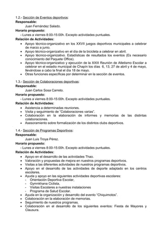 Este documento presenta el programa de prácticas de formación en centros de trabajo (F.C.T.) de cuatro alumnos en la Delegación Municipal de Deportes de Jerez de la Frontera. Incluye el calendario de la F.C.T., los departamentos y secciones en los que realizarán las prácticas, las actividades asignadas a cada departamento y sección, y el plan de rotaciones para que los alumnos participen en todas las áreas.