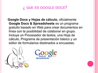 Google Docs es un programa gratuito basado en la web para crear documentos en línea y colaborar en grupo, incluyendo un procesador de textos, hoja de cálculo y presentaciones. Ofrece almacenamiento en la nube, edición en tiempo real y límites en el tamaño de archivo. SlideShare permite compartir presentaciones en línea de hasta 20MB en formato Flash. Un proyecto colaborativo involucra a un grupo de personas con roles diferentes, ofreciendo opiniones múltiples pero también posibles desacuerdos.
