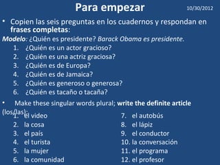 El documento es un plan de lección para la clase de español del Sr. Johnston el 30 de octubre de 2012. La lección incluye responder preguntas en frases completas, convertir palabras singulares a plurales y viceversa, identificar artículos definidos e indefinidos correspondientes a sustantivos, y escribir sustantivos con sus artículos.