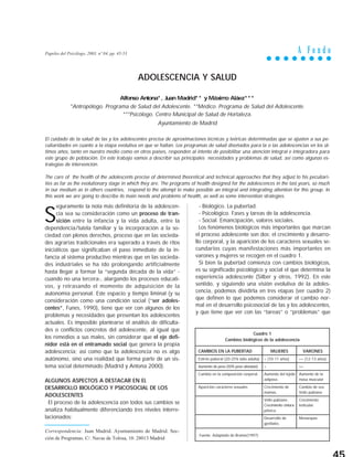 Este documento describe las necesidades y problemas de salud comunes en la adolescencia, así como estrategias para su intervención. Explica que los principales problemas de salud de los adolescentes actuales son consecuencia de sus comportamientos y estilos de vida, como accidentes, consumo de alcohol y drogas, trastornos alimenticios y conductas sexuales de riesgo. También analiza los cambios biológicos, psicológicos y sociales que ocurren durante la adolescencia y cómo afectan a la salud. Finalmente, resalta la importancia de diseñar programas