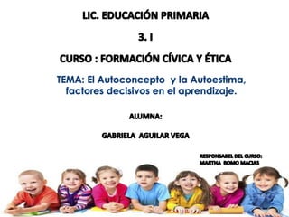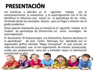 - El documento analiza conceptos como el autoconcepto, la autoestima y la autorregulación y su influencia en el aprendizaje de los estudiantes.