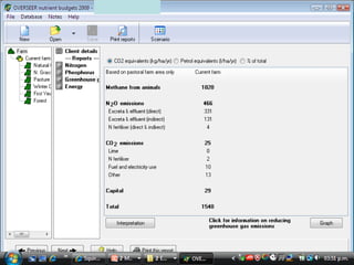 Este documento presenta información sobre el impacto de la ganadería en el cambio climático. Se discute cómo la ganadería emite gases de efecto invernadero como el metano y el óxido nitroso. Se comparan las huellas de carbono de cuatro sistemas ganaderos en Uruguay y Nueva Zelanda, encontrando que los sistemas extensivos de Uruguay tienen mayores emisiones por kg de carne que los sistemas intensivos de Nueva Zelanda. Finalmente, se plantean preguntas sobre cómo mejorar la sustentabilidad ambient