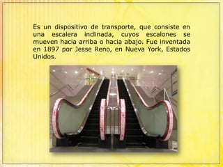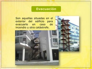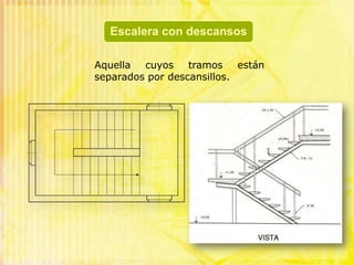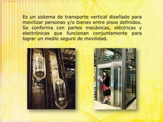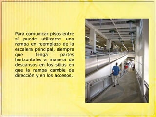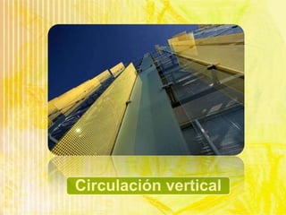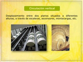 El documento describe diferentes métodos y estructuras para facilitar el desplazamiento entre pisos situados a diferentes alturas, como escaleras, rampas, ascensores y montacargas. Explica los tipos y características principales de cada uno de estos elementos, así como consideraciones de diseño y seguridad.