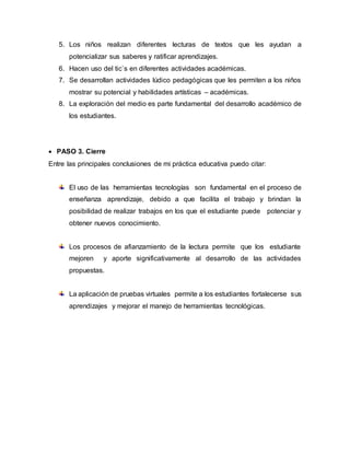 Este documento resume las actividades realizadas en un taller práctico sobre la implementación de enfoques innovadores en una escuela en Turbo, Antioquia. La escuela atiende a 500 estudiantes de preescolar a grado 11 en varias veredas. El taller incluyó conceptualizar la escuela, desarrollar actividades que permiten a los estudiantes ser artífices de su propio aprendizaje usando recursos tecnológicos, y aplicar pruebas virtuales para fortalecer aprendizajes. Las conclusiones fueron que las herram