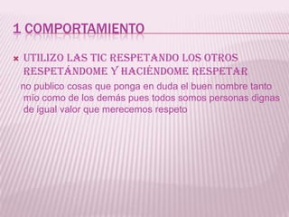 Los 10 comportamientos digitales describen las pautas para un uso responsable y respetuoso de las tecnologías de la información y la comunicación (TIC). Estas incluyen respetar a los demás y proteger su privacidad e integridad, ejercer la libertad de expresión de una manera que no irrespete a los demás, y utilizar las TIC de forma segura y para fines positivos sin promover actividades ilegales o que dañen a otros.