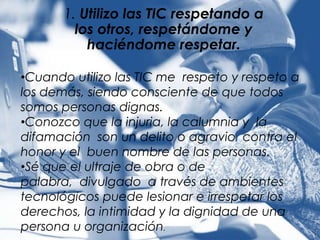 Este documento presenta 10 comportamientos digitales que promueven el uso responsable y respetuoso de las tecnologías de la información y la comunicación (TIC). Estos comportamientos incluyen el respeto a los demás, la protección de la privacidad e identidad personal y ajena, el uso seguro y legal de las TIC, y el cuidado especial para los menores de edad en estos ambientes.