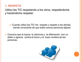 Este documento presenta 10 comportamientos digitales que promueven el uso responsable y ético de la tecnología: 1) respeto, 2) libertad, 3) identidad, 4) integridad, 5) intimidad, 6) autonomía, 7) calidad de vida, 8) cuidado de menores, 9) respeto a la ley, y 10) derechos de autor. Se enfatiza la importancia de proteger la privacidad propia y de otros, no usar identidades falsas, y utilizar la tecnología de forma segura y para fines positivos que mejoren la