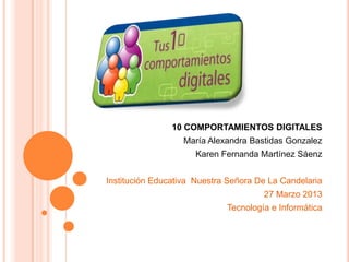 Este documento presenta 10 comportamientos digitales que promueven el uso responsable y ético de la tecnología: 1) respeto, 2) libertad, 3) identidad, 4) integridad, 5) intimidad, 6) autonomía, 7) calidad de vida, 8) cuidado de menores, 9) respeto a la ley, y 10) derechos de autor. Se enfatiza la importancia de proteger la privacidad propia y de otros, no usar identidades falsas, y utilizar la tecnología de forma segura y para fines positivos que mejoren la