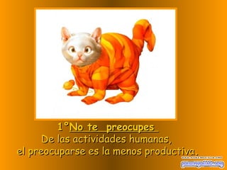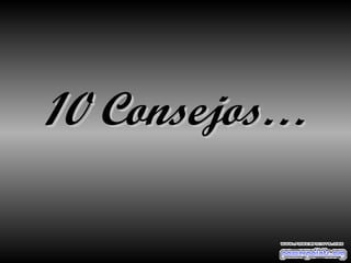 El documento proporciona 10 consejos para enfrentar los problemas y ser feliz. Los consejos incluyen no preocuparse, no dejarse vencer por el miedo, no guardar rencores, enfrentar los problemas uno a uno a medida que ocurren, no llevarse los problemas a la cama, no tomar prestados los problemas de los demás, no vivir en el pasado, ser un buen oyente, no dejarse caer por la frustración, y contar las pequeñas bendiciones.