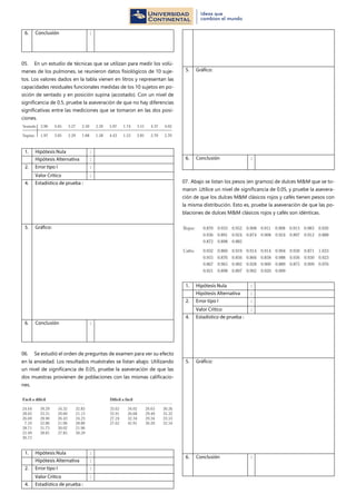 El documento presenta 7 problemas estadísticos no paramétricos para probar diferentes aseveraciones. Estos incluyen usar pruebas para comparar estaturas reportadas vs medidas, ver si la mayoría de personas votaron en una elección, comparar temperaturas corporales vs un punto de referencia, ver si un fármaco reduce la presión sanguínea, comparar mediciones de capacidad pulmonar en posiciones diferentes, comparar calificaciones de exámenes con diferente orden de preguntas, y comparar pesos de M&M de diferentes colores.