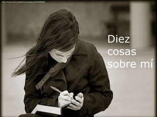 Este documento presenta 10 cosas sobre la persona que lo creó. Cada cosa está representada por una imagen con una breve descripción. Algunas de las cosas que disfruta son ayudar a otros, pasar tiempo con amigos, escuchar música, comer chocolate, viajar y pasar tiempo con la familia. El objetivo general es dar a conocer aspectos sobre su personalidad y estilo de vida a través de estas 10 imágenes y descripciones.