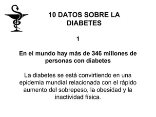 Este documento resume 10 datos clave sobre la diabetes. En particular, señala que hay más de 346 millones de personas con diabetes en el mundo, que se espera que la diabetes sea la séptima causa principal de muerte en 2030, y que la diabetes tipo 2 es la forma más común y puede prevenirse a través de una dieta saludable y ejercicio regular.