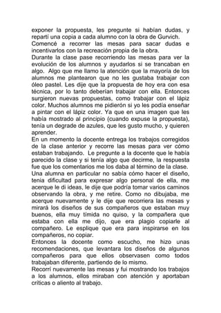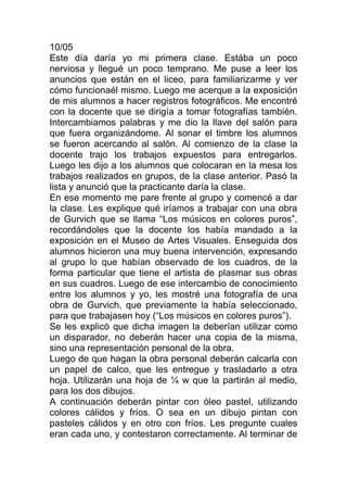La practicante dio su primera clase sobre la obra de un artista uruguayo llamado Gurvich. Los estudiantes analizaron y recrearon una de sus obras usando colores cálidos y fríos. La maestra supervisora dio comentarios positivos y recomendaciones para mejorar a la practicante.