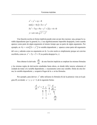 El documento proporciona instrucciones para derivar funciones implícitas. Explica que una función implícita es aquella donde la variable dependiente no está despejada. Detalla los pasos para derivar funciones implícitas: 1) derivar ambos lados de la igualdad, 2) escribir términos con dy/dx a la izquierda y sin dy/dx a la derecha, y 3) despejar dy/dx. Proporciona ejemplos para ilustrar el proceso.