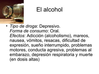 Este documento describe 10 drogas comunes, incluyendo sus tipos, formas de consumo y efectos principales. El alcohol y las drogas como las anfetaminas, metanfetaminas, éxtasis, benzodiacepinas, herbal ecstasy, drogas de diseño, cocaína, crack y heroína pueden causar adicción, problemas de salud como convulsiones e insomnio, y en dosis altas, daño orgánico e incluso la muerte. Muchas drogas representan también un alto riesgo de contraer enfermedades como VIH y