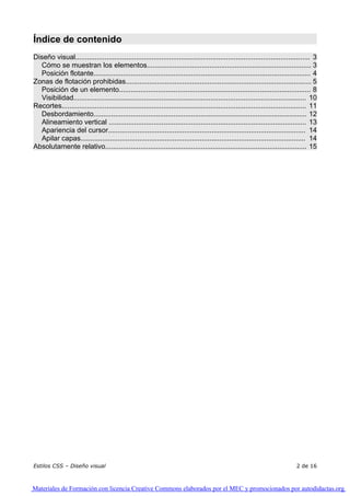 Este documento proporciona una introducción a los conceptos básicos de diseño visual con CSS, incluyendo cómo mostrar elementos, posicionamiento flotante, posicionamiento de elementos, visibilidad y apilamiento de capas. Explica propiedades como display, float, position, z-index y más a través de ejemplos prácticos.