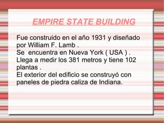 El documento presenta los 10 edificios más altos del mundo, incluyendo información sobre su ubicación, altura, fecha de construcción y materiales. Algunos de los edificios destacados son el Empire State Building en Nueva York de 381 metros construido en 1931, el Shanghai World Financial Centre en China de 492 metros construido en 2008, y el rascacielos más alto, el Burj Khalifa en Dubái de 828 metros construido entre 2004-2010.