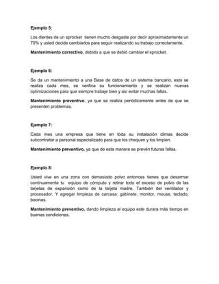El documento presenta 10 ejemplos de situaciones que ilustran mantenimiento correctivo o preventivo. El mantenimiento correctivo implica reparar o reemplazar componentes dañados, mientras que el mantenimiento preventivo busca prevenir fallas mediante limpieza, inspección y reemplazo periódico de piezas.