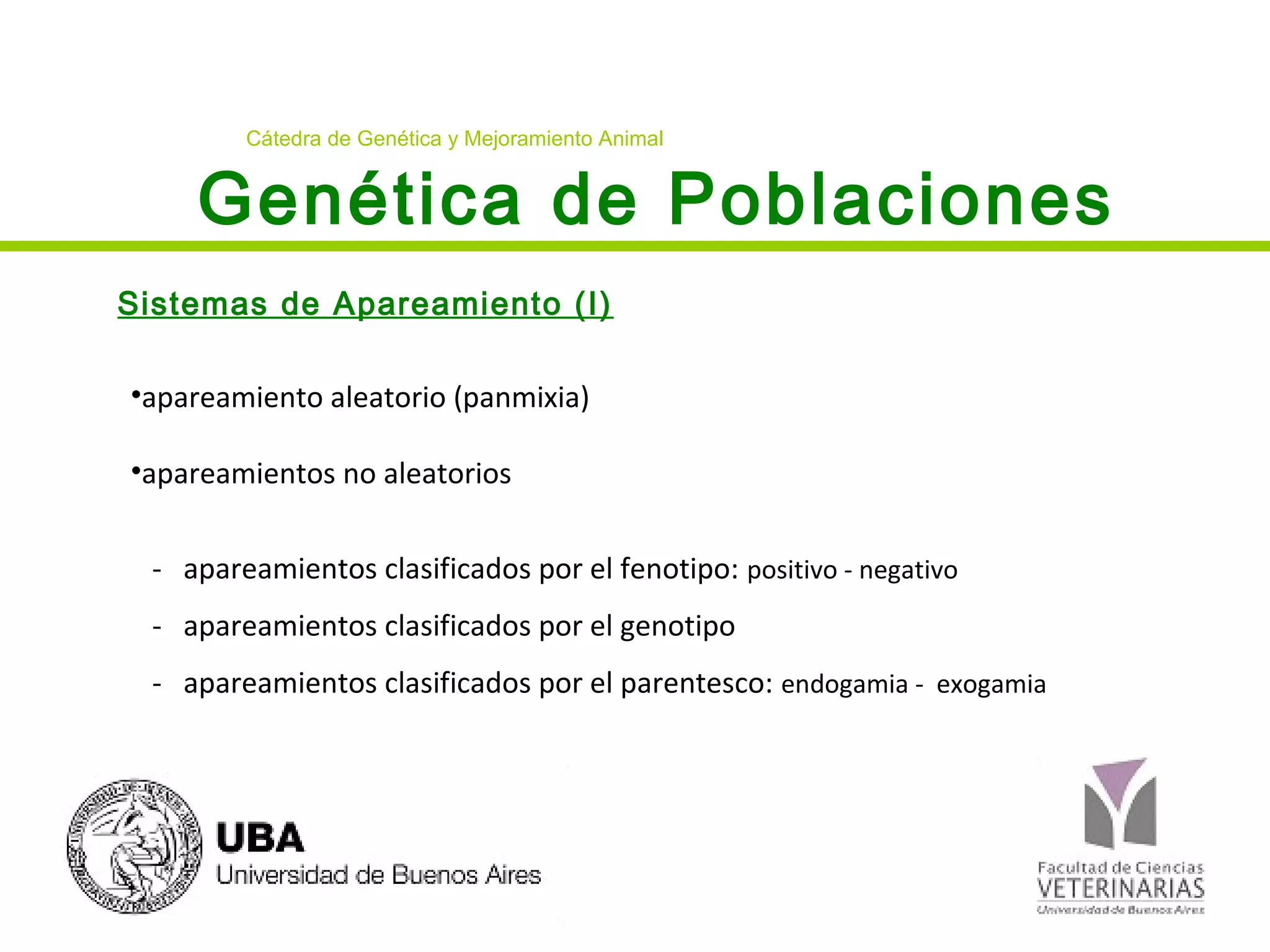 El documento describe diferentes sistemas de apareamiento en poblaciones animales, incluyendo apareamiento aleatorio y no aleatorio. Los apareamientos no aleatorios pueden clasificarse por fenotipo, genotipo o parentesco, como la endogamia o exogamia. La endogamia involucra el apareamiento de individuos emparentados y puede conducir a consecuencias genéticas y fenotípicas como el aumento de la homocigosis, disminución de la varianza genética y depresión endogámica.