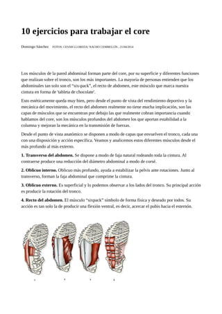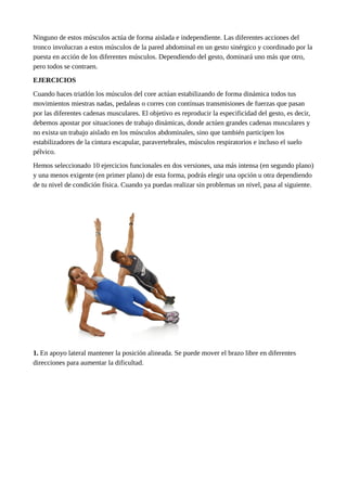 El documento presenta 10 ejercicios para fortalecer el core, destacando la importancia de los músculos profundos abdominales en la estabilidad y mecánica del movimiento. Describe la función de cada músculo en la pared abdominal y proporciona versiones de ejercicios para diferentes niveles de condición física, buscando mejorar el rendimiento en disciplinas como el triatlón. Se enfatiza la necesidad de trabajar de manera dinámica y coordinada en lugar de enfocarse solo en los abdominales superficiales.