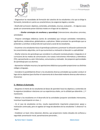 El documento describe las principales funciones del docente en la sociedad actual. Explica que el papel del docente ya no es solo enseñar conocimientos, sino ayudar a los estudiantes a aprender de manera autónoma y a desarrollar habilidades como la resolución de problemas. Las principales funciones del docente incluyen preparar clases interactivas centradas en el estudiante, motivar a los estudiantes, guiarlos en su aprendizaje considerando sus necesidades individuales, y evaluar tanto los aprendizajes de los estudiantes como la efectiv