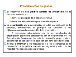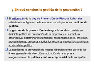 La gestión de la prevención de riesgos laborales consiste en definir la política y estructura organizativa de una empresa para implementar medidas que garanticen la seguridad y salud de los trabajadores, como desarrollar un plan de prevención que evalúe y controle los riesgos laborales, vigile la salud de los empleados y establezca procedimientos de primeros auxilios y autoprotección.