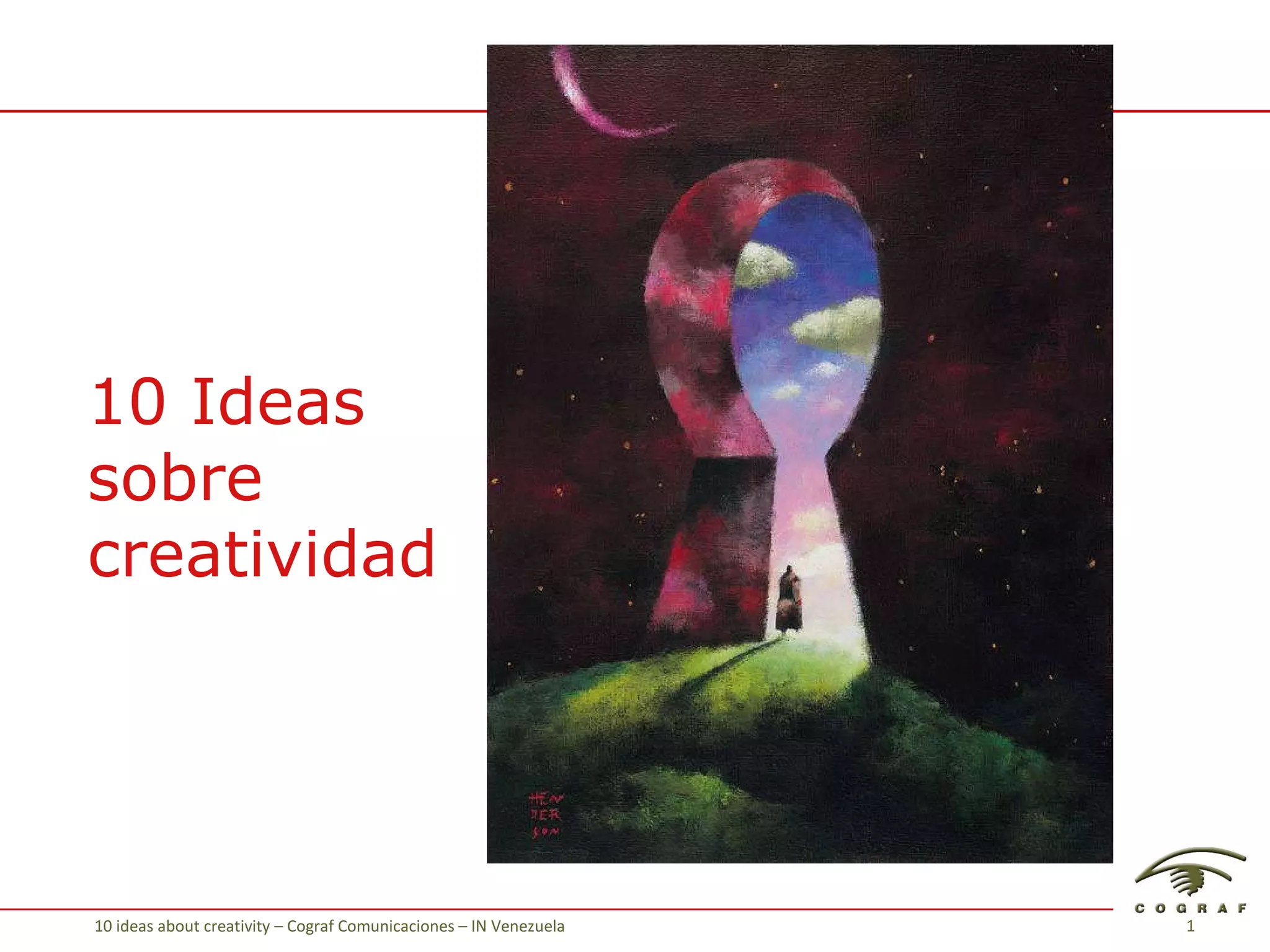 Este documento presenta 10 ideas sobre la creatividad. La creatividad se define como la habilidad de convertir lo ordinario en extraordinario y de ver lo extraordinario en las cosas ordinarias. También es la destreza de tomar decisiones entre múltiples opciones y de encontrar muchas respuestas correctas. La creatividad es un proceso continuo de aprendizaje y práctica más que un punto final, y requiere una mente abierta a nuevas ideas.