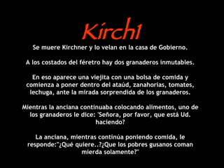 El documento contiene 10 historias breves sobre el expresidente argentino Néstor Kirchner. Las historias incluyen una anciana que coloca comida en su ataúd, perros negros que huyen después de que Kirchner ordena matarlos, y Kirchner alternando entre el cielo y el infierno, causando caos en ambos lugares.