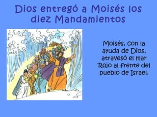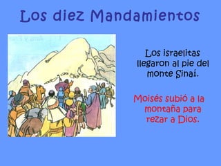 El documento resume los diez mandamientos según el Antiguo y Nuevo Testamento. Moisés recibió los diez mandamientos de Dios en el monte Sinaí. Jesús enseñó que el principal mandamiento es amar a Dios sobre todas las cosas y amar al prójimo como a uno mismo. El documento luego explica brevemente cada uno de los diez mandamientos.