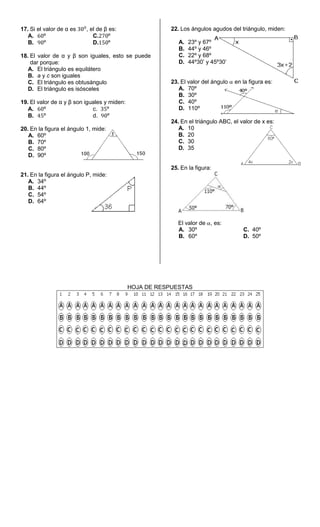 Este documento presenta 25 preguntas de selección múltiple sobre conceptos básicos de triángulos y sus elementos. Las preguntas abarcan temas como las clasificaciones de triángulos, medición de ángulos, relación entre lados y ángulos, y uso de funciones trigonométricas para calcular valores desconocidos. El estudiante debe responder las preguntas para evaluar su comprensión de los fundamentos de geometría y trigonometría.