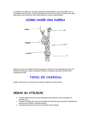 Este documento habla sobre la cabuyería, que es el arte de hacer nudos. Explica que los nudos son importantes para la seguridad, especialmente en la montaña y deportes de riesgo. Luego describe varios tipos de cuerdas y sus usos, así como la importancia de conservar las cuerdas. Finalmente, presenta numerosos nudos específicos, sus usos y cómo hacerlos.