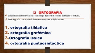El documento detalla las reglas de ortografía y tildación en español, subdivididas en ortografía tildativa, grafémica, léxica y puntuosintáctica. Explica la diferencia entre acento y tilde, las categorías de tildes y sus aplicaciones específicas en diferentes contextos gramaticales. Además, aborda casos especiales de acentuación en palabras compuestas y verbos con enclíticos.