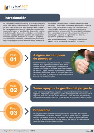 Este documento describe 10 pasos para implementar exitosamente un sistema de gestión de documentos electrónicos (EDMS): 1) Asignar un campeón de proyecto para dirigir la implementación, 2) obtener apoyo de la alta gerencia, 3) prepararse realizando un análisis de requisitos y creando un caso de negocio, 4) iniciar un proyecto piloto en una pequeña sección para probar el sistema, 5) evaluar el piloto y hacer ajustes antes de expandirse, 6) capacitar a los usuarios y dar soporte para aseg
