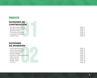 Este documento presenta 10 patrones técnicos comúnmente utilizados para analizar los mercados financieros. Explica cada patrón con detalles sobre su apariencia y significado, incluyendo banderas alcistas y bajistas, triángulos simétricos y expansivos, canales ascendentes y descendentes, y formaciones de inversión como el doble techo y el doble suelo. El objetivo es brindar una guía sobre estas herramientas técnicas para mejorar la comprensión de los movimientos de precios.