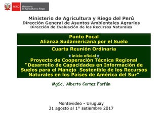 El documento detalla la cuarta reunión ordinaria de la Alianza Sudamericana por el Suelo, enfocado en el proyecto de cooperación técnica regional para el manejo sostenible de los suelos en América del Sur. Se proporciona información sobre la superficie del Perú y clasificaciones de uso de la tierra, así como metodologías y niveles de estudios de suelos. El texto también incluye detalles sobre la superficie estudiada y las actuaciones realizadas en la evaluación de suelos y tierras en el país.