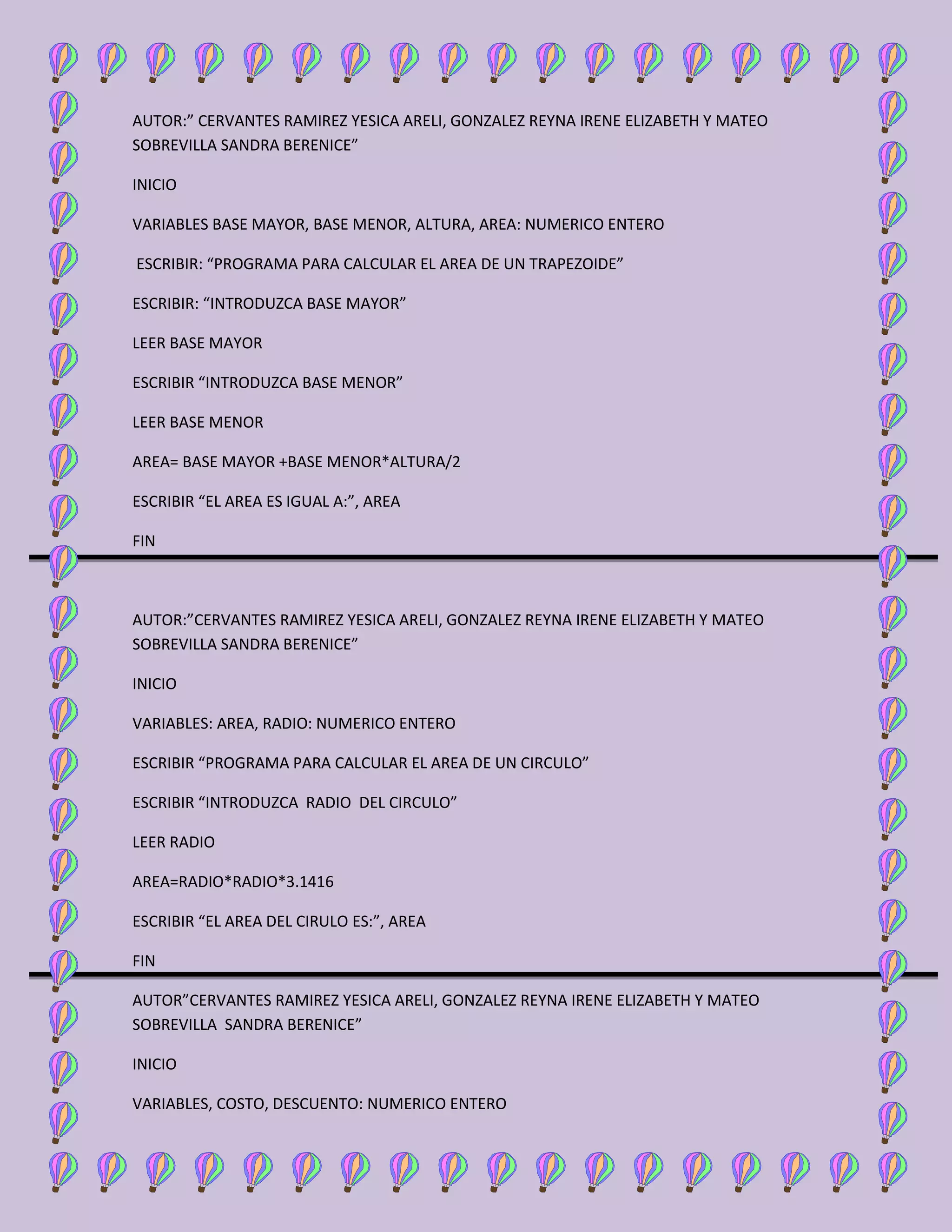 Este documento contiene varios programas en pseudocódigo para calcular áreas geométricas, promedios, descuentos, sumas y ahorros. Cada programa presenta variables, instrucciones y fórmulas matemáticas para resolver un problema específico.
