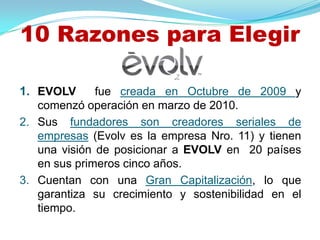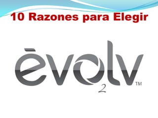 Este documento presenta 10 razones para elegir la compañía EVOLV, incluyendo que fue fundada en 2009, sus fundadores tienen experiencia en crear empresas exitosas, cuentan con capitalización para garantizar su crecimiento sostenible, ofrecen productos patentados que mejoran la salud, y su plan de compensación es uno de los mejores del mercado.