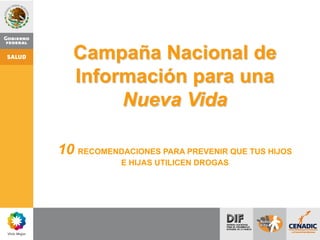 El documento proporciona 10 recomendaciones para que los padres prevengan el uso de drogas en sus hijos, como poner el ejemplo, conocer a los amigos de los hijos, educarlos con valores positivos, fortalecer su autoestima y enseñarles a decir no. También recomienda que los padres estén atentos a señales de alarma como cambios de amigos o de conducta y acudir a centros Nueva Vida o al 018009112000 para obtener apoyo si se sospecha del consumo de drogas.
