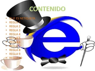 Este documento presenta una serie de reglas de etiqueta para el comportamiento adecuado en internet y las redes sociales. Estas reglas incluyen tratar a los demás con respeto, escribir de manera clara y concisa, compartir información útil y evitar monopolizar conversaciones o recursos. El propósito general es fomentar un ambiente de discusión respetuoso y productivo en línea.