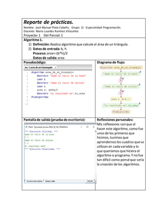 El documento presenta 10 algoritmos desarrollados por José Manuel Plata Cabello para un proyecto de programación. Cada algoritmo calcula una operación matemática diferente (área de figuras, promedio, conversión de unidades, etc.) y describe los pasos, variables de entrada/salida, y reflexiones personales de Plata Cabello sobre lo aprendido al crear cada algoritmo.