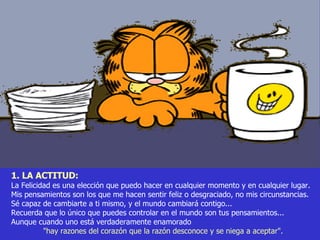 Este documento ofrece 10 secretos para tratar de vivir mejor. Estos incluyen mantener una actitud positiva, cuidar el cuerpo a través del ejercicio, vivir en el presente, amarse a uno mismo, establecer metas específicas, cultivar el humor, valorar las relaciones cercanas, practicar el perdón, dar desinteresadamente a otros, y tener fe. Siguiendo estos consejos, se puede acercar más a la felicidad.