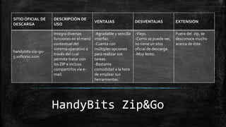 El documento presenta una lista de 10 utilerías de compresión de datos, describiendo su uso, ventajas y desventajas. Se destaca la diversidad de formatos compatibles y la disponibilidad de funciones adicionales en herramientas como WinRAR, 7-Zip y Winzip. Cada herramienta tiene características específicas que pueden ser atractivas según las necesidades del usuario.