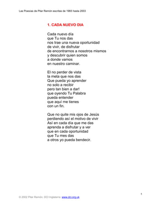 Este documento contiene 14 poemas escritos por Pilar Remón entre 1965 y 2003. Los poemas exploran temas como la fe en Dios, la salvación a través de Jesucristo, el amor de Dios, y la búsqueda de significado. Abordan estas ideas a través de imágenes y reflexiones líricas en pocas estrofas.