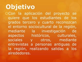 Este documento presenta un proyecto educativo para los grados 3ro y 4to en el Centro Educativo Jurado con el objetivo de que los estudiantes reconozcan el entorno sociocultural de su región a través de investigaciones e historias de personas locales. El proyecto busca promover valores y tradiciones culturales a través de la integración comunitaria con el fin de fortalecer la identidad regional de los niños. Se plantea una pregunta central sobre cómo el contexto sociocultural contribuye a esta identidad y varias preguntas secundarias sobre aspectos