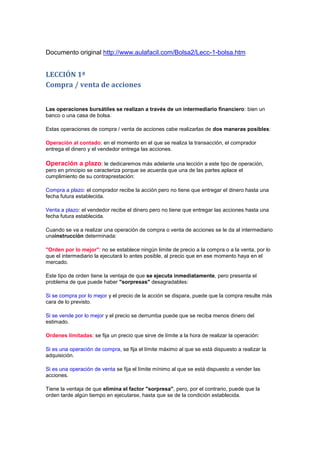 Este documento presenta varias lecciones sobre conceptos básicos de inversiones bursátiles. La Lección 1 explica los tipos de operaciones de compra y venta de acciones, como las operaciones al contado y a plazo. La Lección 2 describe diferentes valores de una acción, como el valor nominal, valor contable y valor económico, pero señala las limitaciones de cada uno para determinar el valor real de una acción.