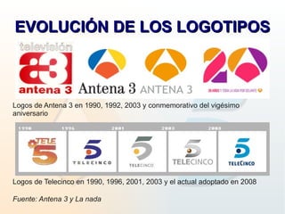 Este documento analiza y compara el grafismo y la identidad visual de Antena 3 y Telecinco en televisión y páginas web. Describe la evolución de sus logotipos a lo largo del tiempo, muestra ejemplos de su imagen antigua y actual, y analiza aspectos como la programación, informativos, canales TDT y diseño de las páginas web de ambas cadenas.