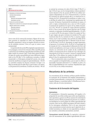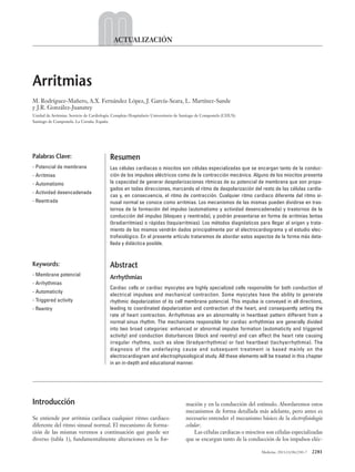 Este documento describe los mecanismos subyacentes a las arritmias cardiacas. Las arritmias pueden deberse a alteraciones en la formación del impulso, como automatismo anormal o actividad desencadenada, o a alteraciones en la conducción del impulso, como bloqueo o reentrada. El documento explica en detalle los potenciales de acción de las células cardiacas y los canales iónicos involucrados, así como los diferentes tipos de arritmias causadas por alteraciones en el automatismo normal o la conducción del impulso.