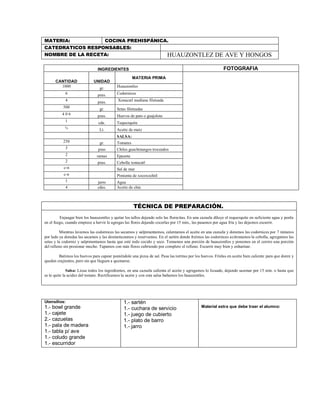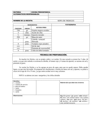 El documento presenta varias recetas de la cocina prehispánica mexicana, incluyendo sopa de frijoles, huauzontles rellenos de ave y hongos, tacos de malva, sopa de hongos y dulce de chilacayote. Proporciona detalles sobre los ingredientes, técnicas de preparación y utensilios necesarios para cada plato típico de la cocina ancestral mexicana.