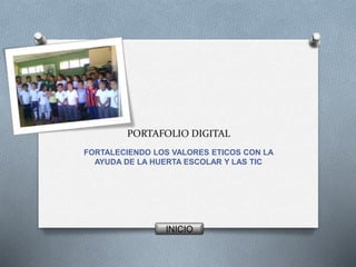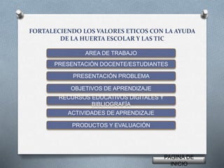 Este documento presenta un proyecto de aula que utiliza una huerta escolar y las TIC para fortalecer los valores éticos en estudiantes de primaria. El proyecto es implementado por dos docentes y busca abordar áreas como ciencias naturales y ética. Incluye objetivos, actividades de aprendizaje como ver videos e investigar qué cultivar, y una evaluación que muestra cómo los estudiantes desarrollaron un interés en los valores y el cuidado del medio ambiente.